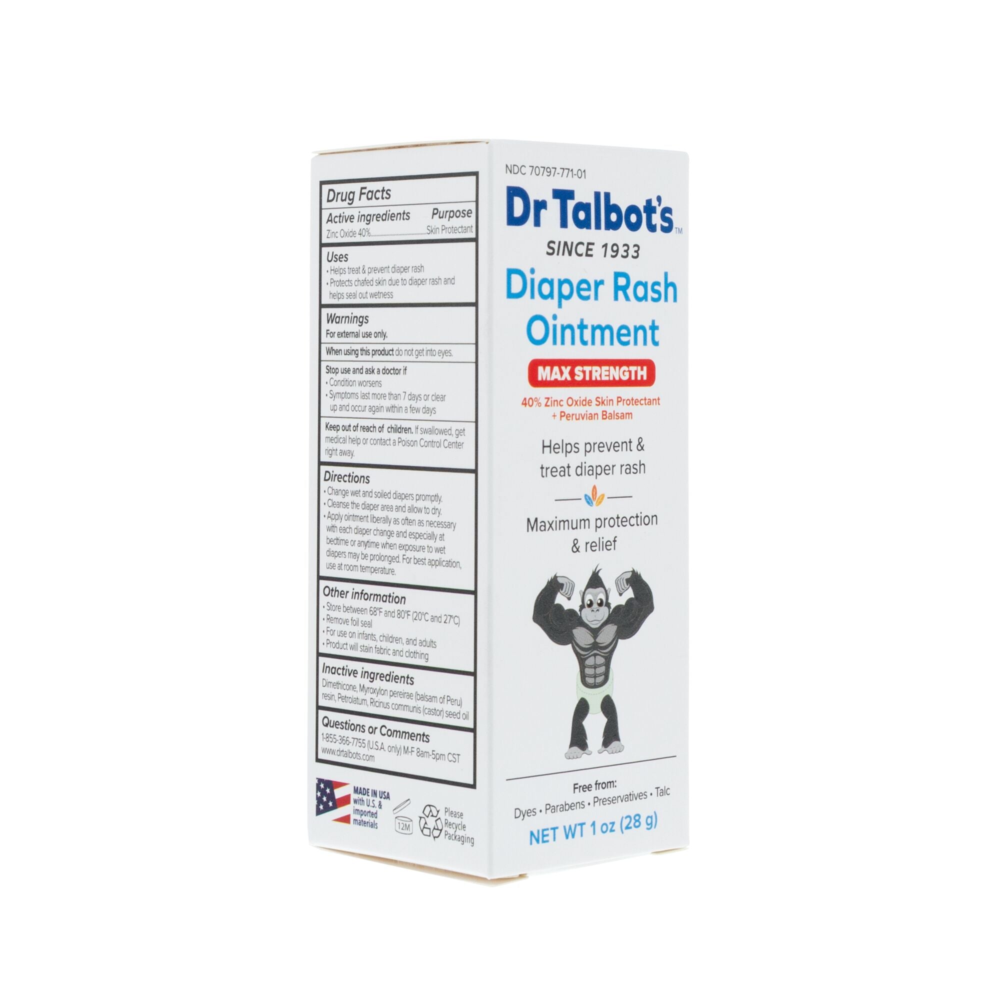 Treat the pain and discomfort of diaper rash with Dr. Talbot’s Maximum Strength Diaper Rash Ointment. Formulated with over double the amount of zinc oxide than our standard ointment. Dr. Talbot’s Diaper Rash Max Strength quickly and effectively provides relief from redness. irritation. and other symptoms like blisters and peeling. Made without dyes. parabens. preservatives or talc. our diaper rash ointment also helps prevent diaper rash by sealing out wetness. Choose the best for your family by choosing Dr. Talbot’s Diaper Rash Ointment Max Strength.